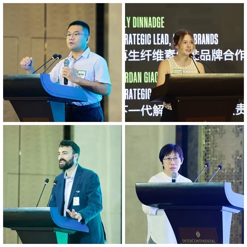 中国化学纤维工业协会纤维素纤维分会秘书长张子昕介绍了中国粘胶纤维领域行业协会及企业在可持续发展中所做的各项工作,包括通过撰写行业可持续发展报告进行信息披露,开展行业绿色生产万里行展现企业绩效及中国企业推出的各具特色的可持续品牌产品;同时其分析了国内莱赛尔纤维的产业发展及下游应用趋势,鼓励更多的终端品牌尝试国产莱赛尔纤维。他表示,协会作为产业链对接交流的平台,希望通过组织纤维-终端品牌的对接活动,串联起上下游两个最重要的产业节点,共同发力打通中间环节,构建可持续纺织产业链。Canopy的再生纤维素纤维品牌合作的战略负责人ELLY DINNADGE,下一代解决方案战略负责人JORDAN GIACONIA共同上台,分享了Canopy在共同推进循环时尚中所做的工作。Canopy在25年来一直致力于避免再生纤维素纤维与纸包装产业链破坏原始濒危森林,努力扩大下一代再生纤维素纤维的规模(由回收纺织品或农业废弃物制成),目前全球已有900多家品牌商、零售商、粘胶纤维企业加入Canopy倡议。JORDAN表示,中国是下一代纺织品产业的全球领导者,越来越多的中国品牌也与Canopy展开合作,期待在未来与中国生产商合作,共同推动下一代材料的应用。中纺联产业部资源综合利用业务主任王琳分享了中国纺联在推动中国循环再利用纤维产业创新发展与实践中的努力,介绍了循环经济与可持续发展模式、纺织产业循环经济发展规划、化纤工业循环经济发展方向,以及纺织行业减量化、再利用、资源化的废纺资源循环利用原则。她分享了目前正在开展的废旧纺织品资源综合利用基础性研究,并对“酒店布草专项”的不同资源利用路径的环境效益和项目总环境效益进行了详细分析。