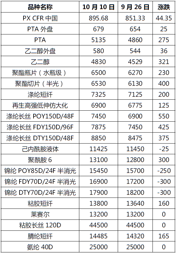 原油:国庆假期期间国际油价持续上涨,但节后首周,国际油价弱势下跌;本周期主要的利空因素为:伊朗及以色列之间的紧张气氛有所缓和,美国能源信息署下调需求增速预测且美国商业原油库存增长。后市来看,地缘因素的支撑可能进一步削减,且需求端忧虑仍在,预计下周国际油价仍有下跌空间。聚酯涤纶:周内聚酯涤纶市场先扬后抑。节前受多重金融利好政策以及假期原油上涨影响,聚酯市场整体表现强势;但随后在油价走弱以及自身供需利好不足背景下试仓开始转弱调整;后市来看,海外宏观变数犹存,产业链基本面利好不足,短期市场反弹乏力。锦纶:本周锦纶长丝市场价格下滑。原料己内酰胺弱势下跌,锦纶成本支撑偏弱,且行业供应整体充裕,周内锦纶长丝价格偏弱下跌。成本支撑有限,需求端亦无利好驱动,预计下周锦纶价格延续偏弱整理走势。氨纶:本周氨纶市场弱稳整理,原料端变化不大,下游需求延续弱势,但考虑到行业利润亏损下,多数氨纶工厂稳价销售。原料在供应增加预期下,其价格存在一定下滑预期,氨纶成本支撑预计转弱,但本月供应端存缩减预期,或对氨纶价格形成一定支撑,综合预计下周市场稳定运行。粘胶短纤:本周粘胶短纤市场价格重心上涨。周内溶解浆价格维持坚挺,成本支撑较强;且粘胶短纤企业库存量维持偏低水平,供货略显紧张,周内工厂报价多有上调,市场重心上涨明显。短期市场在成本支撑及自身供应偏紧背景下,预计粘胶短纤价格仍维持坚挺走势。莱赛尔纤维:本周莱赛尔纤维市场大稳小动,周均价环比持平。周内山东地区部分装置检修,供应有所减少,部分莱赛尔纤维企业周内订单表现尚可,报价重心有所上移,但整体来看,需求端暂无实质性好转,莱赛尔纤维市场重心波动有限。下周来看,山东装置检修进入尾声,供应或有所恢复,但需求端提振有限,业者多持观望心态,预计市场重心或区间整理运行。 腈纶:本周期腈纶价格偏暖运行;虽原料端丙烯腈表现偏弱,但腈纶行业产量缩减明显,对市场价格带来一定提振;下周来看,成本端预计仍缺乏支撑,但供应缩减对市场带来的支撑延续,预计腈纶价格稳中偏暖运行。(信息来源:隆众资讯)