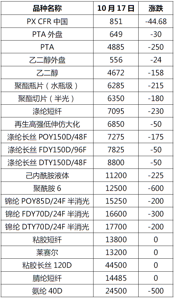 注:外盘为周三价格,PX、PTA、乙二醇外盘单位为美元/吨,其他产品单位为元/吨。涨跌为本期价格与上期报告对比。