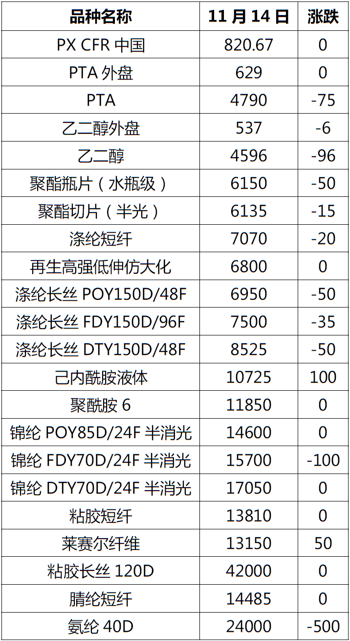 注:外盘为周三价格,PX、PTA、乙二醇外盘单位为美元/吨,其他产品单位为元/吨。涨跌为本期价格与上期报告对比。